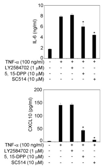 Effects of signal transduction inhibitors on TNF-α-induced production of CXCL10 and IL-6. Sub-confluent TR146 cells were cultured with TNF-α (100 ng/mL) with or without LY2584702 (I μM), 5, 15-DPP (10 μM), or SC514 (10 μM) for 24 h. The amounts of CXCL10 and IL-6 in the supernatant were determined using their respective ELISA kits as described in the Materials and Methods section. Data are expressed as the mean ± SD of 3 independent experiments. * = p < 0.05, significantly different from the TR146 cells stimulated with TNF-α without signal transduction inhibitors.