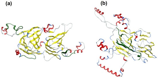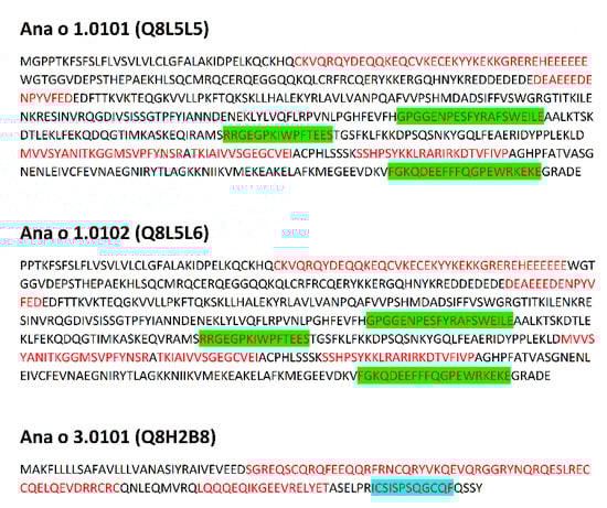 Protein homology models were created and visualized using MOE software (version 2020.09, Chemical Computing Group, Montreal, QC, Canada, https://www.chemcomp.com/ (accessed on 30 August 2020)). Ana o 1.0101 and Ana o 2.0101 allergen models were created using the crystal structures of the major peanut allergens Ara h 1 (pdb 3SMH) [52] and Ara h 3 (pdb 3C3V) [53] as templates downloaded from the pdb website (https://www.rcsb.org/pages/policies (accessed on 30 August 2020)) [54].