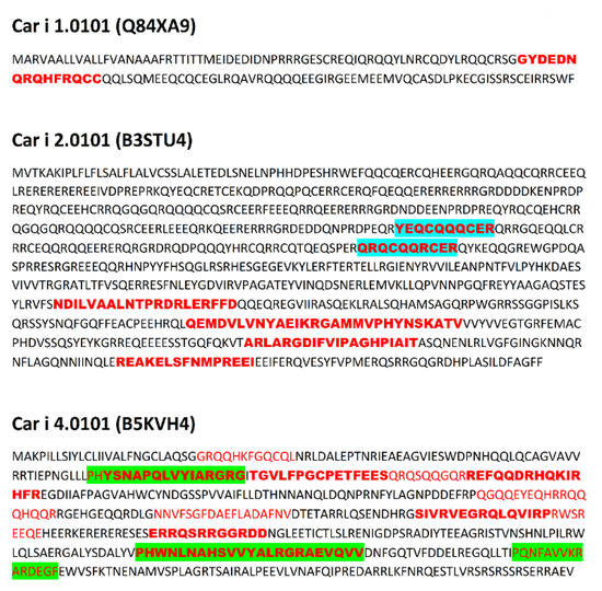 Sequences of allergens from Carya illinoinensis. Location of epitopes is indicated using red font. Green background indicates epitopes with highest ∑A (range 1.6000–2.1000), blue background indicates epitopes with lowest ∑A (range 0.1000–0.5999). Bold font indicates epitopes and their fragments occurring both in Carya illinoinensis and Juglans regia proteins.