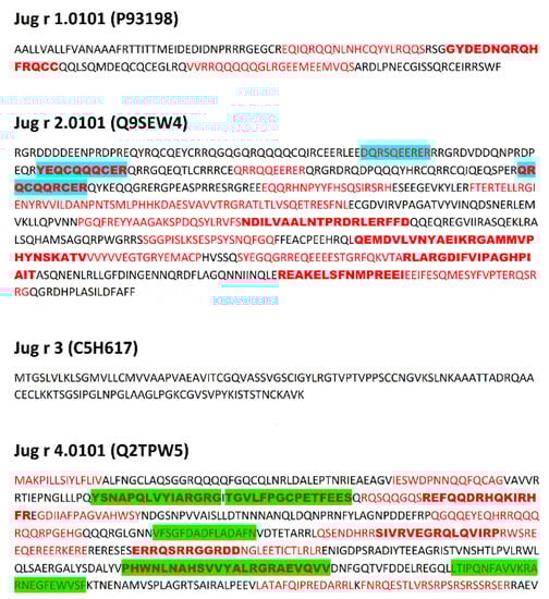 Sequences of allergens from Juglans regia. Location of epitopes is indicated using red font. Green background indicates epitopes with highest ∑A (range 1.6000–2.1000), blue background indicates epitopes with lowest ∑A (range 0.1000–0.5999). Bold font indicates epitopes and their fragments occurring both in Carya illinoinensis and Juglans regia proteins.