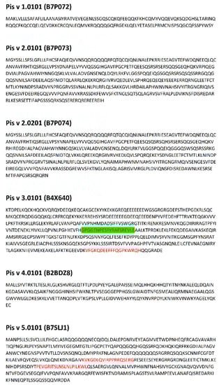 Sequences of allergens from Pistacia vera. Location of epitopes is indicated using red font. Green background indicates epitopes with highest ∑A (range 1.6000–2.1000).