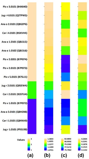 The Immune Epitope Database (IEDB) contains 150 sequential epitopes within the tree nut allergens examined and sequences of their linear epitopes, retrieved from the IEDB, are summarized in Table S2 in Supplementary Materials. Three homologous and commonly immuno-dominant tree nut allergens, including the 2S albumin, 7S vicilin, and 11S legumin, from each species were examined along with a few other allergens included in the IUIS list for walnut and pistachio.
