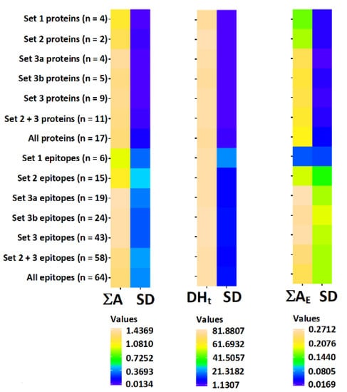 For sets of protein sequences and epitope sequences arithmetic means of ∑A, DHt and ∑AE and standard deviations (SD) were calculated.