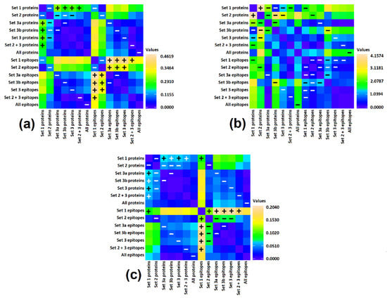 Differences in scores between groups of proteins containing particular sets of domains, expressed as matrices of Euclidean distances: (a) ∑A; (b) DHt [%]; (c) ∑AE Differences subjected to t-test are labeled. Symbol “+” indicates differences that are statistically significant at p < 0.05. Symbol “−“ indicates a lack of statistically significant difference.
