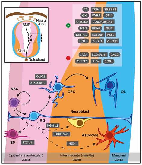 Members of the sex-determining region Y-box transcription factor (SOX) family, such as SOX1, SOX2, and SOX3, can also direct OPCs towards a neuronal fate [33], in contrast to SOX8, SOX9, and SOX10, which favour the turnover of NSCs to OPCs in an autonomous manner [34,35,36]. Additionally, transcription factor forkhead box J1 (FOXJ1) supports the retention of RGs as ependymal cells throughout ventricles. Lastly, glioma-associated oncogene family zinc finger 2 (GLI2), myelin transcription factor 1 (MYT1), NK2 homeobox 6 (NKX2-6), and chromodomain-helicase-DNA-binding protein 8 (CHD8), among others (Table A1), are embryonic cues for OLs specification that vary within CNS regions indicating brain region specificity [37,38,39,40].