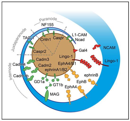 Multiple positive cues are important for the inauguration of ensheathment (Figure 2). Amongst the prime ones with a positive effect on axon-glial junction maintenance is NCAD, which regulates the interaction between OLs processes and axons [165]. The L1 cell adhesion molecule (L1-CAM) and laminin expressed in axons bind to contactin and integrin located in OLs [166]. Upon the formation of the first loops/wraps, neurofascin 155 (NF155), located in paranodal loops, forms a well-defined complex with contactin-associated protein (CASPR) and CNTN1, transmembrane proteins which are expressed in axons [167,168,169]. The activation of this complex has a pivotal role in myelin targeting, sheath growth, organisation of paranodal loops and, therefore, supporting the axoglial junction [170,171]. However, CASPR does not participate in myelin targeting [170]. In juxtaparanodes, the axoglial junction is strengthened when transient axonal glycoprotein-1 (TAG-1), a crucial molecule for maintaining enrichment of Kv1.1/Kv1.2 channels [172], interacts with CASPR2. Regarding internodal axoglial adhesion, glial cell adhesion molecule (CADM) 4 binds to axonal CADM2 and CADM3, facilitating myelin targeting, axon wrapping, and myelin sheath growth [173]. Similarly, CADM1b strongly binds to axonal CADM2, positively regulating ensheathment and strengthening the junction [174]. In the same region of the myelin sheath, MAG binds to ganglioside in axons, especially ganglioside GD1a and GT1b, and enforces the junction’s stability [175,176].