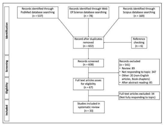 The literature search and article selection were completed by two of the authors (G.P. and L.E.) from January to April 2022. One reviewer (G.P.) then ran a new search across the databases to check the reference lists in the selected studies and in review articles (excluded from the final analysis) to identify any additional papers covering the topics of interest.