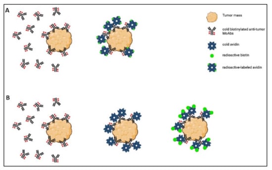 In the two-step protocol, the tumor is first targeted with cold biotinylated antitumor MoAbs, and then radioactive-labeled avidin is administered [23]. The three-step protocol involves (1) tumor pretargeting with cold biotinylated antitumor antibodies, (2) administering cold avidin to remove circulating biotinylated antibodies and ensure avidination of the biotinylated tumor-bound antibodies, and (3) labeling the tumor with radioactive biotin derivatives [22]. Both protocols have been tested in preclinical and clinical settings, but only the clinical studies are considered in this review. We selected nine articles that could be divided according to the type of tumor treated: three articles concerning various types of tumors, three articles concerning gliomas, and three articles dealing with breast cancer. A summary of the content of these articles is given in Table 2.