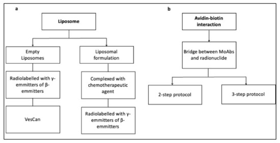 Liposomes have long been of great interest in the sphere of nuclear medicine, probably due to their versatility and easy synthesis. They were first studied for use in delivering radionuclides for imaging purposes (i.e., 111In), up until VesCan was developed and then unfortunately abandoned due to its weak ability to detect tumors. More recently, radiolabeled liposomes have been used mainly as probes in pharmacokinetic studies. Although this application seems far removed from the concept of a TRT, having the opportunity to visualize a therapeutic agent during its deposition in a tumor represents a huge advantage in cancer treatment, and a likely future application in nuclear medicine research. The practice of combining diagnostics and therapy—also called theranostic—has already gained substantial ground.