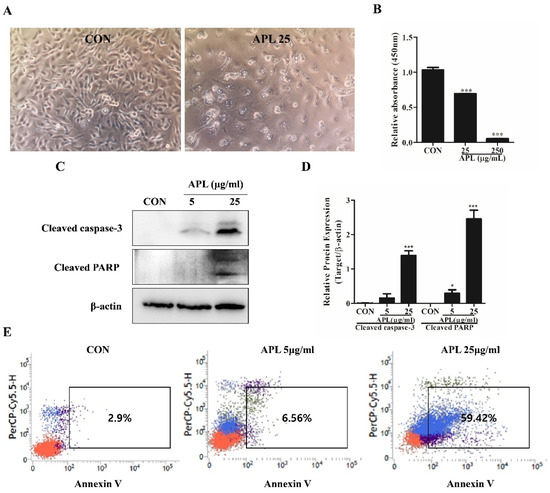 To investigate whether APL affects the proliferation of YD-10B cells, the cells were treated with different concentrations (25 and 250 μg/mL) of APL for 72 h, and cell viability was assessed using the MTT assay. Before the CCK-8 assay, the cell morphology was observed using a phase-contrast microscope; the images revealed that APL treatment led to changes in cell morphology. As shown in Figure 1A,B, APL caused a significant dose-dependent decrease in the proliferation of YD-10B cells. At doses of 25 and 250 μg/mL, the proliferation of YD-10B cells was reduced by approximately 50% and 90%, respectively. Based on these results, 25 μg/mL of APL was used to examine its effects on YD-10B cell apoptosis; the cellular apoptotic proteins cleaved caspase-3 and cleaved PARP were analyzed by western blotting. The results indicated increased levels of these protein (Figure 1C), suggesting that APL affects cell proliferation and apoptosis at 25 μg/mL. Annexin V expression was detected using flow cytometry analysis (FACS); annexin V expression increased with increase in APL concentration in a dose-dependent manner (Figure 1D), further providing clear evidence of cell apoptosis.