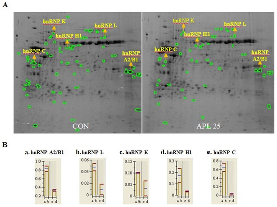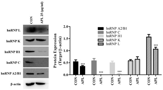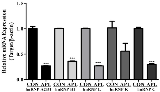 LC-MS/MS analysis showed decreased expression of hnRNP family proteins, including hnRNP A2B1, hnRNP L, hnRNP H1, hnRNP K, and hnRNP C. To further confirm these findings, the cells were treated with 25 μg/mL APL, harvested after 72 h, and real-time PCR was performed using the corresponding primers. The results of real-time PCR were consistent with 2D-GE results (Figure 3).