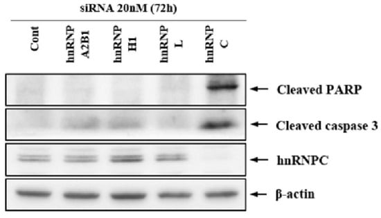 Apoptosis effect of hnRNP family protein silencing in YD-10B cells. The cells were transfected with siRNAs and incubated for 72 h. Next, siRNA efficiency was evaluated, and hnRNP C protein expression was specifically silenced using hnRNP C siRNA. Only hnRNP C siRNA-transfected group showed increased expression of the apoptosis markers cleaved caspase-3 and cleaved PARP.
