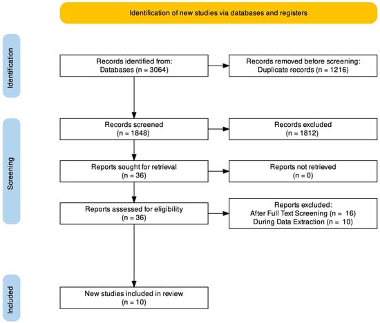 The PRISMA flow chart is shown in Figure 1. A total of 3064 potentially relevant studies were identified. After the deduplication procedure, 1848 records remained. After screening titles and abstracts, 1812 records were excluded. Among the remaining 36 records, only 10 full text articles evaluating the effect of six different nutraceuticals (Maca Root, SAMe, Rosa Damascena, Ginkgo Biloba, Saffron, and Yohimbine) versus placebo were considered eligible according to the inclusion/exclusion criteria, and therefore included. These studies were published between 2002 and 2019 and carried out in the USA (n = 4), Iran (n = 4), South Korea (n = 1), and UK (n = 1). All the studies were RCTs, 9 double-blinded [35,36,37,38,39,40,41,42,43] and 1 triple-blinded [44], and they assessed a population of depressed patients treated with ADs and suffering from AISD. One study compared different doses of Maca Root [35], one study Maca Root and placebo [37], one SAMe and placebo [36], two Rosa Damascena and placebo in males and females, respectively [38,39], two Gingko Bilboa and placebo [40,44], two Saffron and placebo [41], and one Yohimbine (along with Olanzapine and Mirtazapine) and placebo [42]. Table 1 shows a detailed summary of the core characteristics of the studies included.