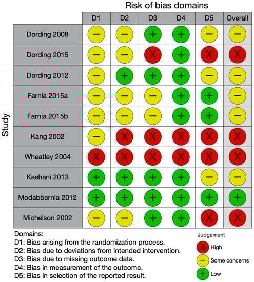 As shown in Figure 2, the quality assessment of the included studies resulted in an overall moderate or poor quality, except for the study by Modabbernia et al. [43], comparing Saffron and placebo in males, that was at low risk of bias. The randomization process also arose some concerns for seven studies: it was at high risk for one study and at low risk for two studies. The risk of bias due to deviations from intended intervention was low for three studies only, which accounted for missing data. We defined at risk of bias for missing data those studies with 5% missing data for SD, as suggested by the Cochrane RoB 2.0, unless any corrective statistical procedure was applied, or the dropout rate was equally distributed between groups. Half of the studies were at low risk of bias for missing data, while the remaining were at high risk or aroused some concerns. Most of the studies used validated clinical scales for measuring sexual side effects, except for those by Kang et al. [40] and by Wheatly et al. [44] Finally, only part of the trials had a trial registration allowing us to check for selection bias. Three studies only complied with their trial registration, and we considered them at low risk of bias; for the other studies, the trial registration was missing, or the study deviated from it, if present.