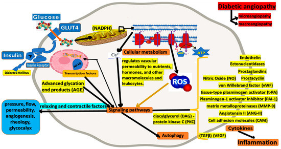 Increased calpain activity (calcium-dependent protease) induced in response to hyperglycemia may contribute to DM cardiovascular complications. Studies regarding immunoprecipitation showed that glucose causes NO loss through a calpain-dependent decrease in the association of hsp90 with endothelial NOS. In addition, the inhibition of calpain activity decreased the expression of the endothelial cell surface of the proinflammatory adhesion molecules ICAM-1 and VCAM-1 during hyperglycemia. Moreover, the inhibition of PKC activity reduces leukocyte–endothelium interactions by suppressing the surface expression of endothelial cell adhesion molecules in response to increased oxidative stress [19].