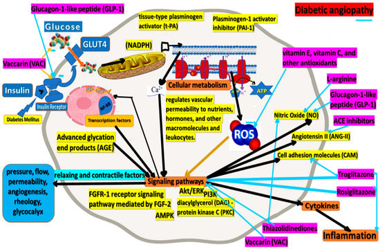 According to various research hypotheses, the adverse effects of diabetes on the vascular system through the influence of hyperglycemia [10], especially on the endothelium, as possible targets include changes in cellular redox status, altered oxidized/reduced forms of nicotinamide adenine dinucleotide (NAD+/NADH) ratio [11]; dysregulation of tyrosine kinase proteins, whose activity is influenced by the redox state of their sulfhydryl groups [12]; protein kinase C (PKC) disorder [13]; and sorbitol accumulation [3]. In addition to being a vital part of the body’s metabolic environment, insulin also has other physiological functions, such as regulating the blood flow and increasing glucose uptake in skeletal muscle. The actions of insulin-stimulating agents, by stimulating the production of vascular endothelium’s nitric oxide (NO), can also improve the blood flow and increase glucose uptake in skeletal muscle. The actions of insulin are mainly mediated by the phosphatidylinositol-3-kinase (PI3K) [14].
