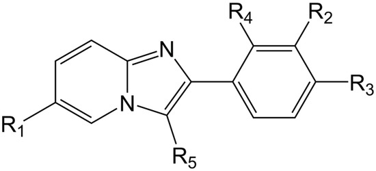 The literature provided a data set of 33 imidazo [1,2-a]-pyridine derivatives as selective positive allosteric modulators of α1-containing GABAARs [16]. The anti-psychotic activities, related to positive allosteric modulation of α1-containing GABAARs and expressed in nM, were converted into the corresponding pKi (pKi = −log10 Ki) values, which are used as dependent variables in this study. The chemical structures of all used molecules are represented with appropriate SMILES notation with their pKi listed in Table S1 (see Supplementary Materials), while their general chemical structure is presented in Figure 1. One of the main requirements for developing QSAR models with the Monte Carlo optimization method is that SMILES notation for all molecules be canonized in the same manner. For this purpose, all molecules were drowned using ACD/ChemSketch 2018 v2.5 (Toronto, ON, Canada). The same software was used to obtain the SMILES notation of all molecules. Final SMILES notation canonization was performed using OpenBabel v2.4.1 (Pittsburgh, PA, USA). From the original data set, three random splits into the training (25 compounds, 75%) and test set (8 compounds, 25%) were generated, and for all splits, the normality of the activity distribution was checked according to the literature [17].