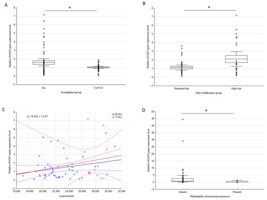 (A)—box-whiskers plot for RUNX1 gene expression level comparison between ALL and control group, data presented as mean, standard error, and 95% confidence interval, raw data are presented as individual dots; (B)—box-whiskers plot representing the difference in RUNX1 gene expression level between the high- and standard-risk patients, data presented as mean, standard error and 95% confidence interval, raw data are presented as individual dots; (C)—scatterplot showing correlation between indicated RUNX1 gene expression and leukocytosis of ALL patients with subdivision for B-ALL (blue) and T-ALL (red), line represents a linear model fit whereas the dashed line indicates 95% confidence interval, each dot represents an individual; (D)—box-whiskers plot representing the differences in RUNX3 gene expression and Philadelphia chromosome presence, data presented as median, interquartile and non-outlier range, raw data are presented as individual dots. * p < 0.05.