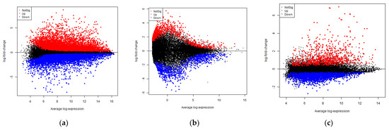 MA plots illustrating the distribution of differentially expressed genes (DEGs) in (a) rheumatoid arthritis (RA), (b) osteoarthritis (OA), and (c) Porphyromonas gingivalis (PG) macrophages based on the following statistical parameters: p-value ≤ 0.05 and log2-fold change (logFC) ≥ ±1. The red and blue dots indicate genes that have been considerably up- and down-regulated, respectively, whereas the black dots indicate genes with no significant difference between the diseased and control groups.