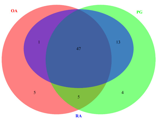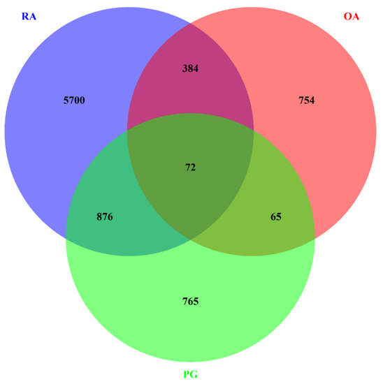 Venn diagram representing the intersection of differentially expressed genes (DEGs) in rheumatoid arthritis (RA), osteoarthritis (OA), and Porphyromonas gingivalis (PG) macrophages. All three data sets shared 72 DEGs.
