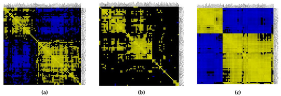 A gene–gene correlation grid map illustrating the correlation between an expression similarity matrix across multiple samples in synovial macrophages in (a) rheumatoid arthritis (RA), (b) osteoarthritis (OA), and (c) Porphyromonas gingivalis (PG) stimulated macrophages individually using Cladist. A Pearson correlation coefficient (r) score of >0.7 was used to screen out significantly correlated gene–gene pairs. Pairs of genes that are co-expressed in similar patterns are labeled yellow; anti-correlated genes are designated blue, and those with no relationship are rendered black according to the correlation coefficient threshold.