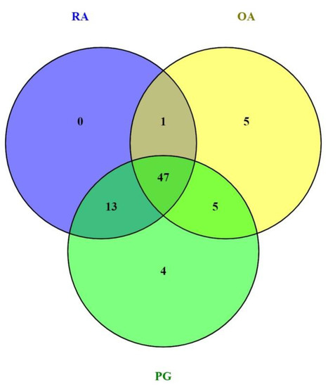 A total of 72 genes common in RA, OA, and PG-SM were selected for the gene–gene correlation network (Supplementary File: Table S1). The expression values of each sample for the 72 common DEGs in RA, OA, and PG-SM were extracted individually. Three gene–gene correlation matrices were constructed using the Cladist tool [40,43]. Forty-seven genes out of seventy-two common DEGs were highly correlated based on their Pearson correlation coefficient (r-value) values. Table 2 shows the r-values, logFCs, and p-values for each of the 47 highly correlated DEGs in RA, OA, and PG-SM. Genes were selected based on a Pearson correlation coefficient (r score) > 0.7. A gene–gene correlation grid map for the overlapping highly correlated DEGs in RA, OA, and PG-SM is shown in Figure 4, and a Venn diagram representing the overlapping highly correlated gene set is shown in Figure 5. The genes were separated into up- and down-regulated genes based on logFC ≥ ±1. Two genes, IER3 and RGS16, were found to be up-regulated in all three data sets; as a result, they were utilized for additional investigation. These genes may be crucial in the shared pathogenic pathways that underlie the states of these disorders.