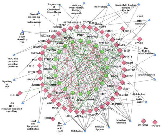 The GeneMANIA plugin was used to predict interactions between the 47 highly correlated common DEGs and 20 additional related genes in the network, using Homo sapiens as the source organism. The network comprised 85 nodes and 399 edges (Supplementary File: Table S2). The pathway interaction information from GeneMANIA showed that the majority of the genes were found to be participating in “Metabolism”, “Immune System”, “Signaling Pathways”, “Class I MHC mediated antigen processing & presentation”, “Inflammasomes”, “Metabolism of lipids”, “Nucleotide-binding domain, leucine rich repeat containing receptor (NLR) signaling pathways”, and “The NLRP3 inflammasome”. However, our work was focused on physical and genetic interactions to better understand the physical and molecular mechanisms associated with the hub genes. Therefore, all the nodes with less than two edges were removed, and pathway interactions were omitted, leaving a network with 53 nodes and 271 edges (Figure 6). Among the 53 nodes, 33 were DEGs, and the remaining 20 were related genes.