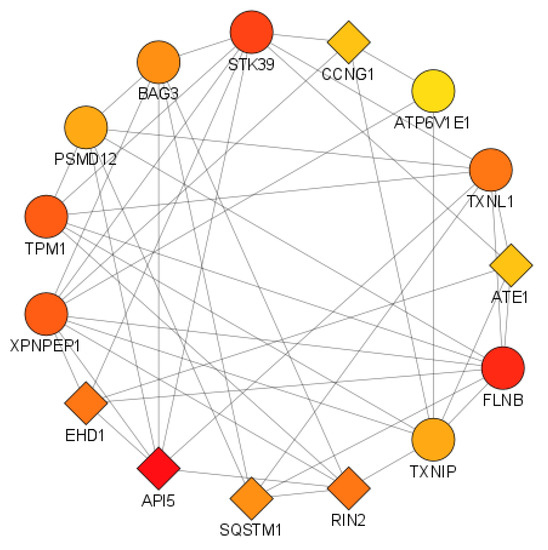 The Cytoscape plugin cytoHubba was used to calculate the network centrality parameters. In order to identify key nodes in the interaction network, the parameters DC, BC, BN, and CC were selected. The top 15 nodes with high DCs were selected to create a subnetwork of hub genes (Figure 7). Among the top 15 hub genes, 6 genes, namely API5, ATE1, CCNG1, EHD1, RIN2, and SQSTM1, were common DEGs, while the remaining (ATP6V1E1, BAG3, FLNB, PSMD12, STK39, TPM1, TXNIP, TXNL1, XPNPEP1) were related genes added by GeneMANIA (Table 3).