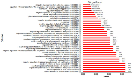 Of the 15 hub genes, 11 were significantly (p-value ≤ 0.05) enriched in 36 GO-BP terms (Figure 8). The enriched genes (and their respective counts) were STK39 (12), SQSTM1 (8), TPM1 (8), EHD1 (6), BAG3 (5), PSMD12 (4), API5 (3), FLNB (2), ATE1 (1), TXNIP (1), and TXNL1 (1). Among them, SQSTM1, EHD1, API5, and ATE1 were DEGs, while STK39, TPM1, BAG3, PSMD12, FLNB, TXNIP, and TXNL1 were related genes added by GeneMANIA (Table 3). The BP terms that were enriched with more than one hub gene were regulation of apoptotic process [GO:0042981] (API5, BAG3, STK39, SQSTM1), negative regulation of programmed cell death [GO:0043069] (API5, BAG3, SQSTM1), negative regulation of apoptotic process [GO:0043066] (API5, BAG3, SQSTM1), interleukin-1-mediated signaling pathway [GO:0070498] (PSMD12, SQSTM1), regulation of transcription from RNA polymerase II promoter in response to stress [GO:0043618] (PSMD12, BAG3), cytoskeleton organization [GO:0007010] (TPM1, FLNB), and cellular response to oxidative stress [GO:0034599] (TXNL1, TPM1).