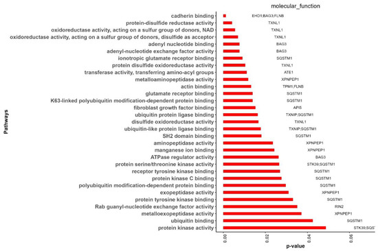 Twelve of the fifteen hub genes were significantly (p-value ≤ 0.05) enriched in thirty-two GO-MF terms (Figure 9). The enriched genes were SQSTM1 (13), TXNL1 (5), XPNPEP1 (5), BAG3 (4), FLNB (2), STK39 (2), TXNIP (2), API5 (1), ATE1 (1), EHD1 (1), RIN2 (1), and TPM1 (1). Among them, SQSTM1, API5, ATE1, EHD1, and RIN2 were DEGs, while TXNL1, XPNPEP1, BAG3, FLNB, STK39, TXNIP, and TPM1 were related genes. The MF terms that were enriched with more than one hub gene were cadherin binding [GO:0045296] (EHD1, BAG3, FLNB), protein serine/threonine kinase activity [GO:0004674] (STK39, SQSTM1), protein kinase activity [GO:0004672] (STK39, SQSTM1), actin binding [GO:0003779] (TPM1, FLNB), ubiquitin protein ligase binding [GO:0031625] (TXNIP, SQSTM1), and ubiquitin-like protein ligase binding [GO:0044389] (TXNIP, SQSTM1).