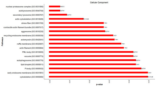 In 18 GO-CC terms, 5 of the 15 hub genes were significantly (p-value ≤ 0.05) enriched (Figure 10). The enriched genes were SQSTM1 (7), TPM1 (7), EHD1 (3), FLNB (2), and PSMD12 (1). SQSTM1 and EHD1 were DEGs, while TPM1, FLNB, and PSMD12 were related genes. Actin cytoskeleton [GO:0015629] (TPM1, FLNB), and cytoskeleton [GO:0005856] (TPM1, FLNB) were the CC terms that were enriched with more than one hub gene.