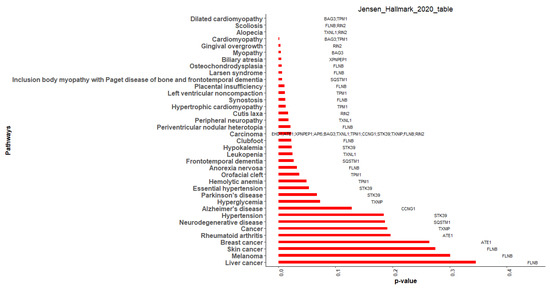 Finally, Jensen DISEASES, an Enrichr feature that emphasizes links between genes and diseases, further supported the finding. Of the 15 hub genes, 13 were enriched in 25 Jensen DISEASES terms (Figure 12). The enriched genes were FLNB (9), TPM1 (7), RIN2 (5), BAG3 (4), TXNL1 (4), SQSTM1 (2), STK39 (2), XPNPEP1 (2), API5 (1), ATE1(1), CCNG1 (1), EHD1 (1), and TXNIP (1). Of the over-represented genes, RIN2, SQSTM1, API5, ATE1, CCNG1, and EHD1 were DEGs, while FLNB, TPM1, BAG3, TXNL1, STK39, XPNPEP1, and TXNIP were related genes. The Enrichr-Jensen DISEASES terms that were enriched with more than one hub gene were carcinoma (EHD1, ATE1, XPNPEP1, API5, BAG3, TXNL1, TPM1, CCNG1, STK39, TXNIP, FLNB, RIN2), dilated cardiomyopathy (BAG3, TPM1), alopecia (TXNL1, RIN2), scoliosis (FLNB, RIN2), and cardiomyopathy (BAG3, TPM1).
