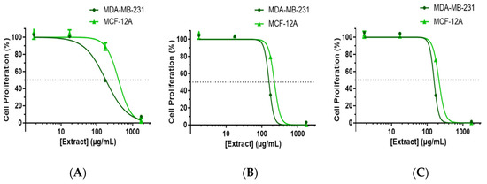 To observe a potential selective effect, the ECAL was also studied on healthy breast cells (MCF-12A): ECAL incubated for 24 h revealed to suppress MCF-12A cells proliferation only with concentrations above approximately 100 μg/mL. In fact, the IC50 (24 h) for MCF-12A was 223 μg/mL, i.e., 1.4 higher than that observed for MDA-MB-231 (Figure 1A). For longer incubation periods (48 h or 72 h), the difference in the concentration–response curve for the two cell lines in study is attenuated; however, the IC50 (48 h or 72 h) for MDA-MB-231 is still lower compared to MCF-12A values (158.1 or 155.2 compared to 220.6 or 211.1, respectively—Figure 1B or Figure 1C).