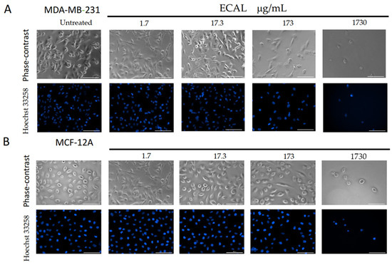 Morphological changes induced by increasing concentrations of the hydroethanolic extract of C. album leaves (ECAL) (1.7–1730 μg/mL) incubated for 24 h in (A) MDA-MB-231 cells or (B) MCF-12A cells. Upper panel—representative images from five independent experiments obtained under an objective lens of a phase-contrast of the Lionheart microscope; lower panel—representative images from five independent experiments with nuclei stained with Hoechst 33258 (blue) obtained under an objective lens of a Lionheart microscope. Scale bar = 100 μM.