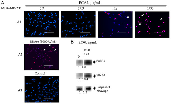 To confirm the occurrence of apoptosis (suggested by data observed in Figure 2), double stranded DNA fragmentation was evaluated by TUNEL assay in ECAL-treated MDA-MB-231 cells (Figure 3A). Results of the increasing concentrations of ECAL (1.7–1730 μg/mL) showed that DNA fragmentation occurred with 173 μg/mL, after 24 h of incubation. Cancer cells exposed to DNAse (used as a positive control) were also positively stained, as expected. As a control, cancer cells treated with solvent (control) or only with medium (not shown) did not exhibit fluorescence staining compatible with apoptotic cells. Cleaved caspase-3 expression (apoptosis marker) increased in ECAL-treated cells (Figure 3B). These results are compatible with ECAL-induced cell death by apoptosis instead of necrosis in MDA-MB-231 cells.