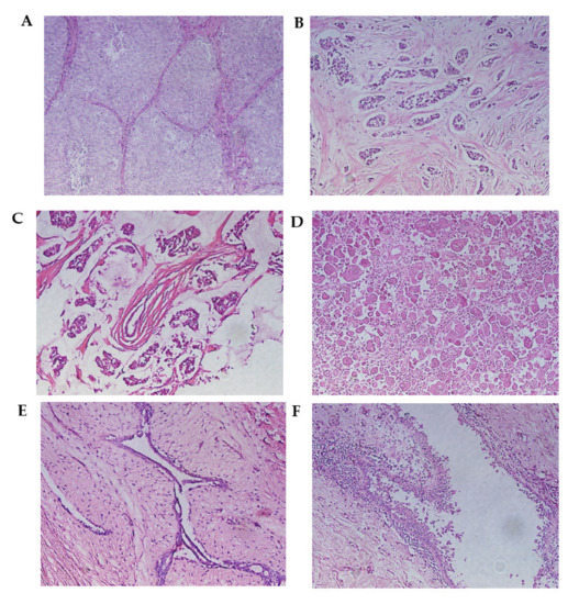 Malignant breast neoplasms. (A) Infiltrating ductal carcinoma (solid pattern) separated by connective tissue septa. (B) Infiltrating lobular carcinoma. This is characterized by the invasion of the stroma in the form of fine cell cords, called Indian row cords. (C) Mucinous carcinoma. Tumor cells are seen within lakes of mucin. (D) Metaplastic carcinoma. (E) Fibroadenoma. The proliferation of cells can be observed, creating well-defined borders concerning the surrounding normal tissue. (F) Mastopathy with hyperplasia. A duct with apocrine metaplasia and foci of hyperplasia can be observed. Hematoxylin and eosin staining. Optical microscopy magnification 20×.