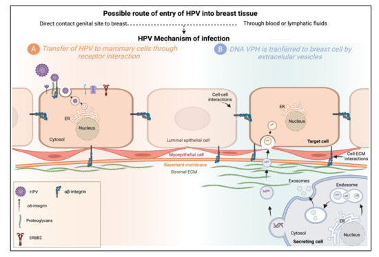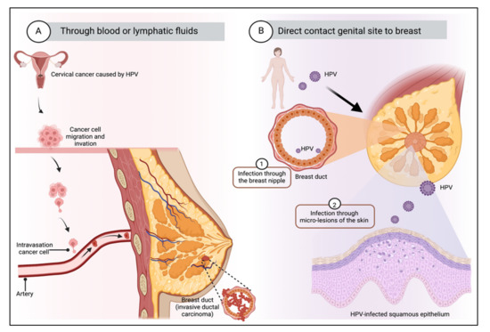 The mechanism by which HPV can infect mammary gland cells is still unknown. However, two main hypotheses have been proposed; they are summarized in Figure 2. The first one explains that HPV arrives in mammary glands via the lymphatic or blood system through HPV-carrying mononuclear cells present in women with cervical intraepithelial lesions [86]. Other authors conclude that because the HPV life cycle occurs in the epithelial layers, HPV viremia is impossible [43]. The second hypothesis suggests that the mammary gland can be infected with HPV through the skin of the nipple, as demonstrated in the work of Villiers et al. [29], who proposed a retrograde ductal pattern of viral propagation. The exposure of the mammary ducts to the external environment increases the risk of HPV infection since the mammary ducts are open ducts and could serve as an entry point for viral infection. Furthermore, most mammary neoplasms originate from the epithelium of these structures [81]. Sexual transmission is the generally accepted transmission route, although it does not seem to be the only one. Some studies suggest that transmission can occur through hand-mediated contact between the female perineum and the mammary gland, which could occur during sexual activity, or through contact of bodily fluids with nipple fissures, which could serve as an entry point for HPV [4].