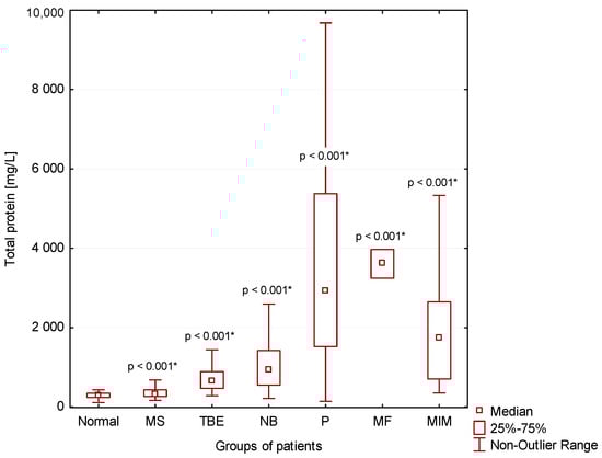 CSF total protein concentrations in our patient groups (*: statistically significant).