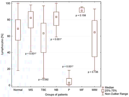 A significantly higher percentage of lymphocytes in CSF compared to normal CSF findings was found in patients with MS (p < 0.001) and NB (p < 0.001), and a significantly lower percentage of lymphocytes was found in patients with purulent inflammation (P) in the CNS (p < 0.001 *) (Figure 4).