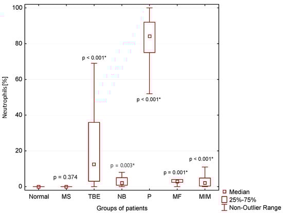 A significantly higher percentage of neutrophils in CSF compared to normal CSF findings was found in patients with TBE (p < 0.001), NB (p = 0.003), P (p < 0.001) and MIM (p > 0.001). The absolute highest neutrophil count is typical for patients with purulent inflammation in the CNS (P) (Figure 5).