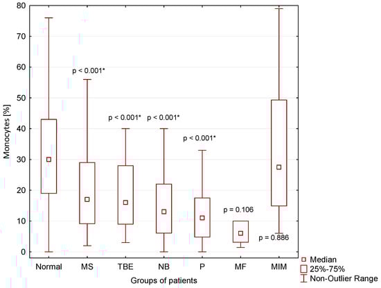 A significantly lower percentage of monocytes in CSF compared to normal CSF findings was found in CSF of patients with MS (p < 0.001), TBE (p < 0.001), NB (p < 0.001) and P (p < 0.001) (Figure 6).