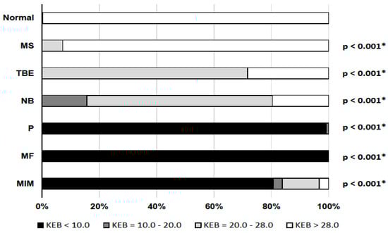 Distribution of KEB values in subgroups of our patients (*: statistically significant).