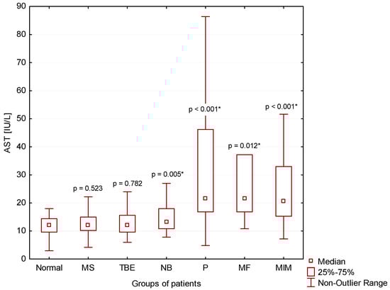 We found significantly higher AST catalytic activities in the CSF of patients with NB (p = 0.005), P (p < 0.001), MF (p = 0.012) and MIM (p < 0.001) compared to normal findings (Normal) (Figure 8).