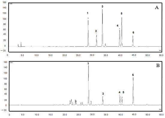 HPLC chromatograms of standards (A) and the root extract of C. harmandiana (B) using a Phenomenex C18 column (250 mm × 4.6 mm, 5 μm) and a gradient mobile phase of 0.1% formic acid (A) and acetonitrile (B) at wavelength 270 nm. Xanthoxyletin (1), osthol (2), nordentatin (3), 7-methoxyheptaphylline (4), heptaphylline (5) and dentatin (6).