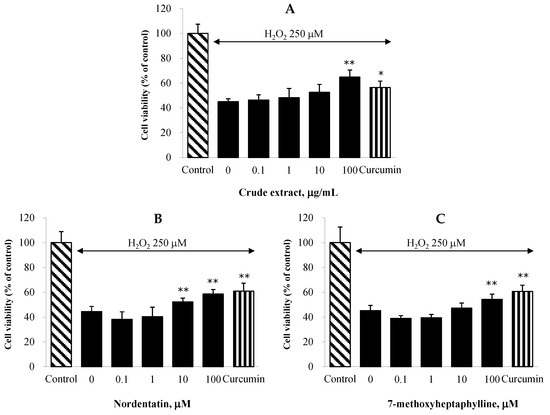 Effect of the CH extract at the concentrations of 0, 0.1, 1, 10, and 100 μg/mL (A) and its constituents nordentatin (B) and 7-methoxyhepthaphylline (C) at the concentrations of 0, 0.1, 1, 10, and 100 μM on H2O2-induced oxidative cell damage in NG108-15 cells. Curcumin (10 µM) was included as a reference standard. Data are means ± SDs (n = 5). Statistical significance was determined by one-way ANOVA. For Turkey’s post hoc analyses: * p < 0.05 and ** p < 0.01 compared with the H2O2-treated control group.