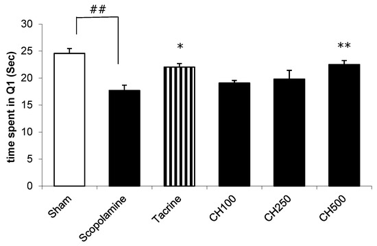 The Morris-water-maze task (MWM) was performed to study the hippocampus-dependent spatial-learning ability. MWM is a model used to assess long-term memory by tracking the escape latency with time [38]. If the animals spent longer swimming time in the target quadrant where the platform had formerly been located during training, this indicated that the mice had greater spatial memory [38]. Figure 4 illustrates the MWM results. The mice in the scopolamine-treated group (means ± SEMs; 17.73 ± 0.94 s) spent significantly shorter time in target quadrant (Q1) than those in the control group (means ± SEMs; 24.56 ± 0.91 s). Pretreatment with tacrine (10 mg/kg), a positive control, improved memory performance; apparently, the longer time was spent in the target quadrant Q1 when compared to the mice in the scopolamine-treated group. Additionally, the animal groups pretreated with the CH extract at a dose of 500 µg/mL (means ± SEMs; 22.52 ± 0.71 s) spent more time swimming in Q1 than the only scopolamine-treated group. The results indicate that the CH extract could improve long-term memory impairment induced by scopolamine in mice.
