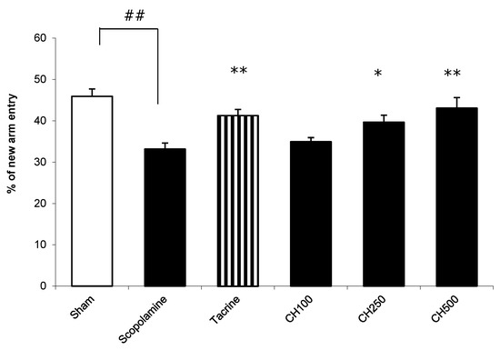 In the present study, we investigated the effects of the CH extract on scopolamine-induced memory impairments in mice utilizing the Y-maze and Morris-water-maze models. Scopolamine, a nonselective, centrally acting muscarinic-receptor antagonist, blocks cholinergic signaling and produces memory deficits [37]. Thus, scopolamine was used to induce a memory deficit in the mice in this study.