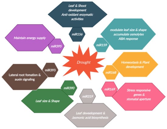 Physiological, molecular and transcription levels of drought tolerance were well characterized in crop plants [3,122]; however, miRNA mediation has not yet been properly explained [11]. In addition to plant development, miRNAs also regulate abiotic stress-responsive genes in plant species [123]. So, by understanding the mechanism through which miRNAs respond to stress-responsive genes and which genes are the targets of miRNAs will help to develop more resistant plants [124,125]. As an important regulator of the plant regulatory network, prior importance was given to miRNAs for post-transcriptional regulation of drought tolerance [125]. Due to their salient features, drought-responsive miRNAs were characterized in Arabidopsis, cereals and oil seed crops [126,127,128,129,130]. Role of various miRNAs to overcome the drought tolerance traits has been shown in Figure 1. A study about the miRNA transcriptome using high-throughput sequencing technologies in wild barley may be an effective way to determine the drought resistance attributes of miRNAs and their target genes [9]. When maize plants were subjected to drought stress, various miRNAs were upregulated, and some miRNAs were downregulated [131]. Drought stress also upregulated the expression of miRNAs in wheat [132] and rice [133,134]. In Arabidopsis, the gene expression of miR393, miR397, and miR402 increased, while the expression of miR319c and miR389a decreased under dehydration stress [99]. miR398 and miR408 are thought to induce drought tolerance in pea (Pisum sativum) [135] and clover [136]. In tomato plants, miR159, miR169, miR160, miR167, miR393 are associated with dehydration stress tolerance, by controlling hormonal signal transduction, stomatal closure and auxin-responsive genes [137,138]. miR164 was expressed in the leaf and roots of orchard grass when these plants were exposed to dehydration treatments [139]. A significant decrease in the expressions of miR530a, miR1445, and miR1447 in Populus trichocarpa was observed in plants under limited water stress, which varies from the expression pattern of miR1450 under drought conditions [140]. Similarly, when sugarcane plants were subjected to drought, several miRNAs showed higher expression and some were downregulated [141]. Further, it was observed that the expression pattern of miRNAs is also plant tissue growth stage and cultivars dependent. ABA treatment in rice downregulates the expression of miR167 [142]; however, drought stress upregulates it in Arabidopsis [143]. miR169 was downregulated in Arabidopsis and clover during drought, while it was upregulated in rice [144]. Drought stress reduced the expression of miR398 in maize [130], whereas its expression increased in clover [144].