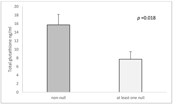 | at least one null | 18 | 0.121 | 6 | 0.046 | 2.84 (1.12–7.17), p = 0.027 | 2.39 (1.40–4.08) p = 0.001 |