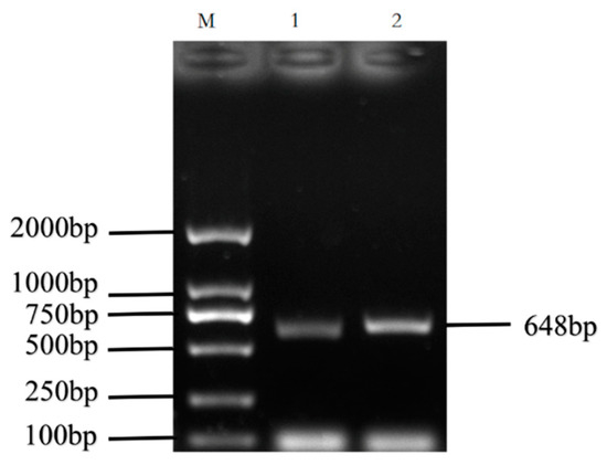 PCR amplification products of the Bactrian camel HSL coding sequence (CDS). M, DL2 000 marker; 1 and 2, PCR product.